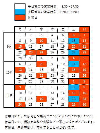 令和7年(2025年) 9月、10月、11月の営業日(予定)