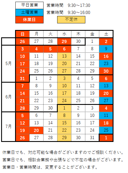令和8年(2026年) 5月、6月、7月 の営業日(予定)